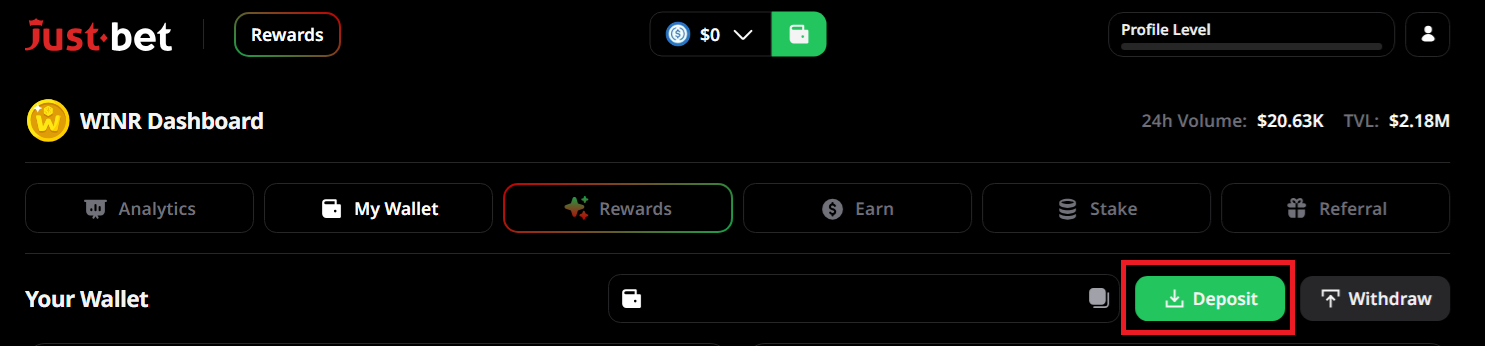 1. Visit the [Just Bet app](https://www.just.bet/) and connect your wallet.\